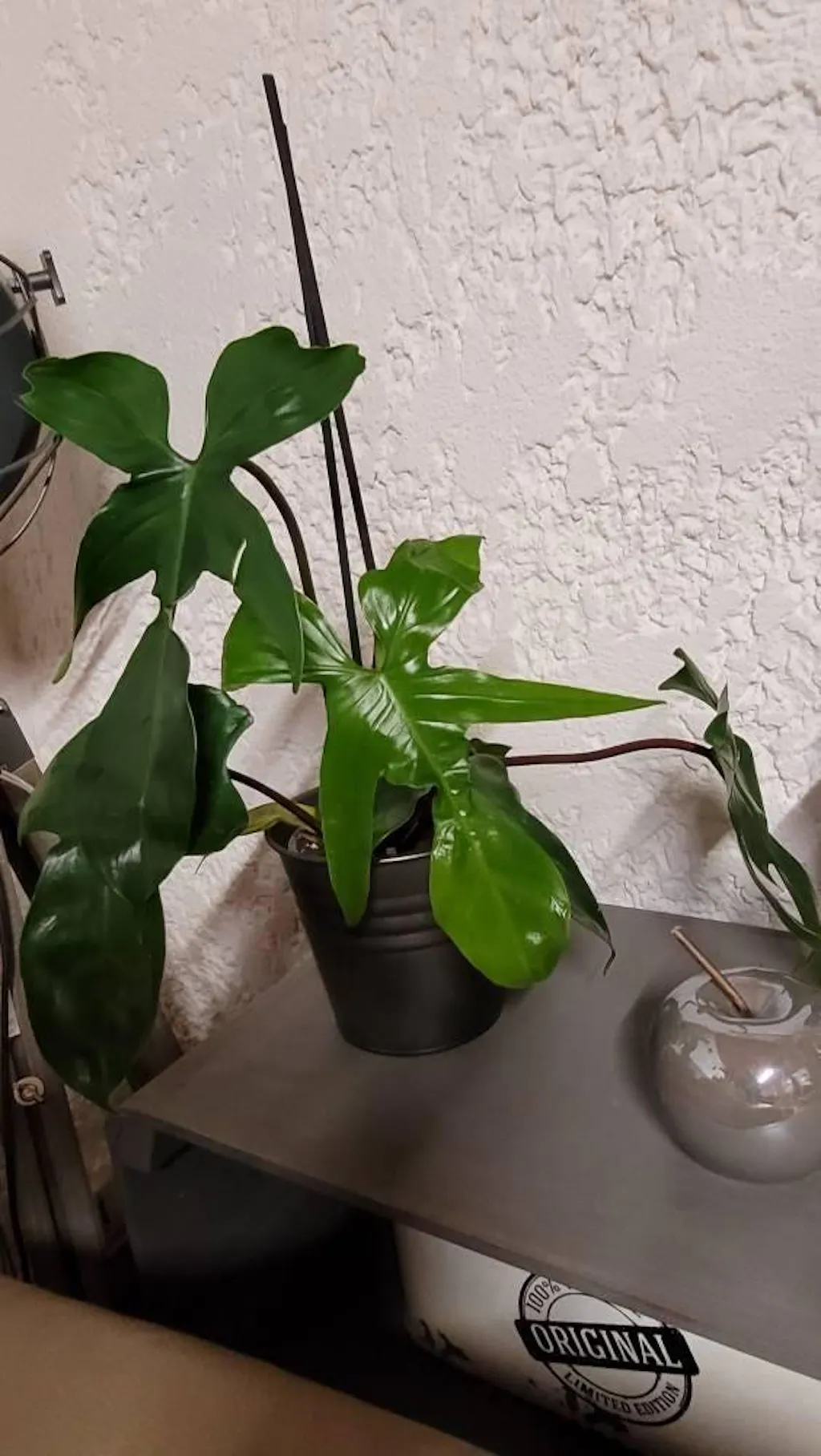 Ein eleganter Philodendron mit tief gelappten, glänzend grünen Blättern und rötlichen Blattstielen.