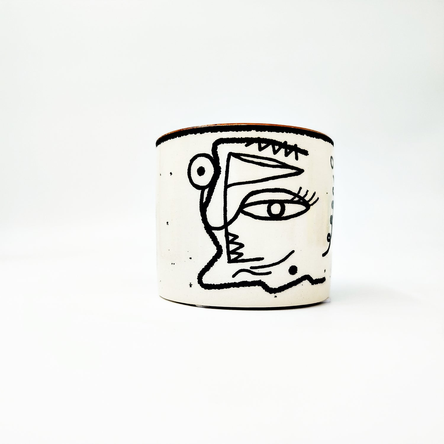 Ceramic planter paying homage to Frida Kahlo, with colorful floral patterns.