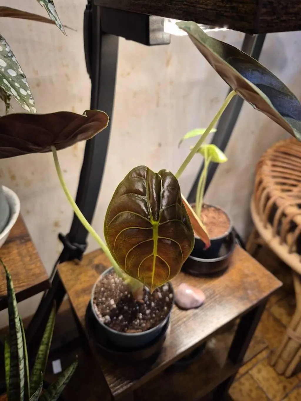 An exceptional alocasia with its thick leaves with coppery-red metallic reflections, changing according to the light.